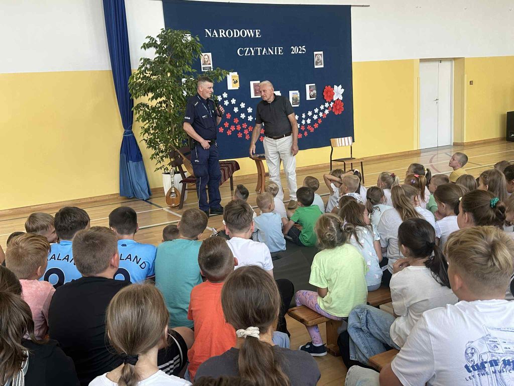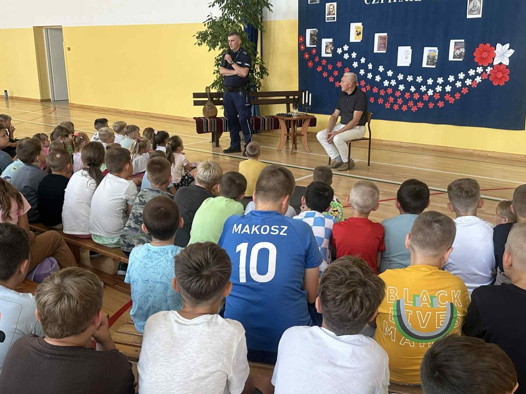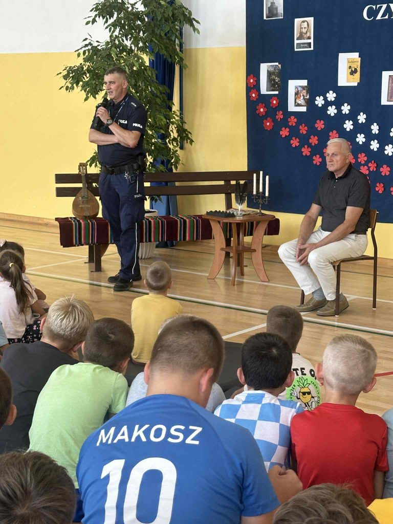 W dniu 10. 09. 2025 r. naszą szkołę odwiedził policjant Pan Andrzej Ostrowski, który przeprowadził pogadankę dla uczniów klas I–VIII na temat bezpieczeństwa w ruchu drogowym. Podczas spotkania poruszył m.in. kwestie bezpiecznego poruszania się pieszych i rowerzystów, a także omówił planowane zmiany w przepisach dotyczących korzystania z hulajnóg elektrycznych.