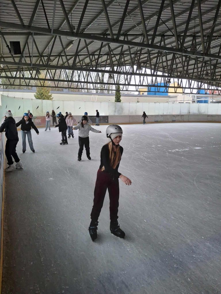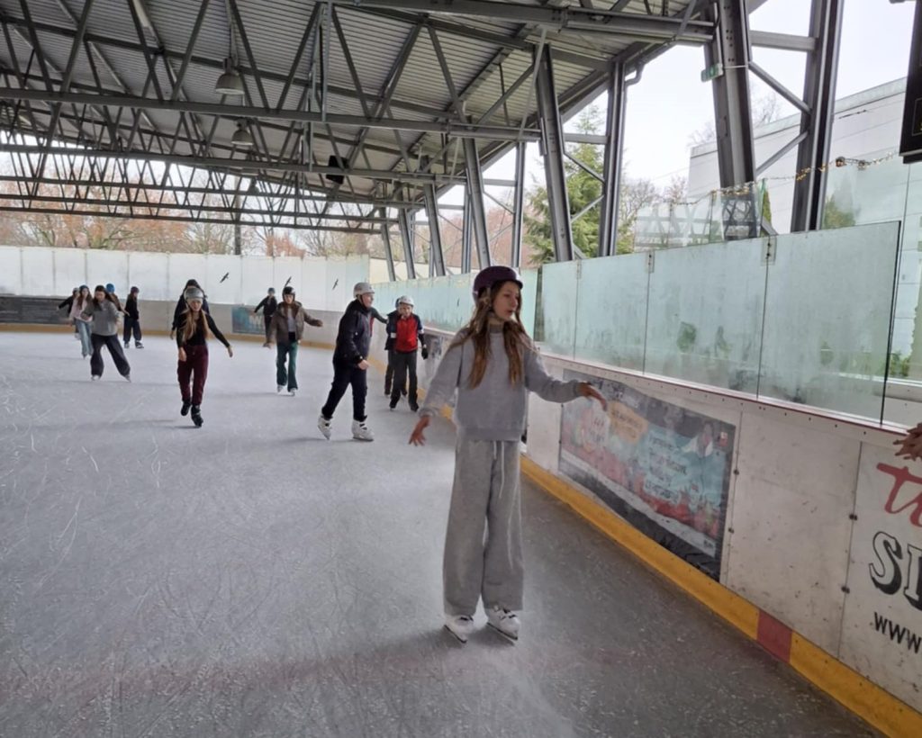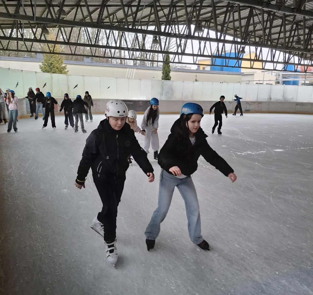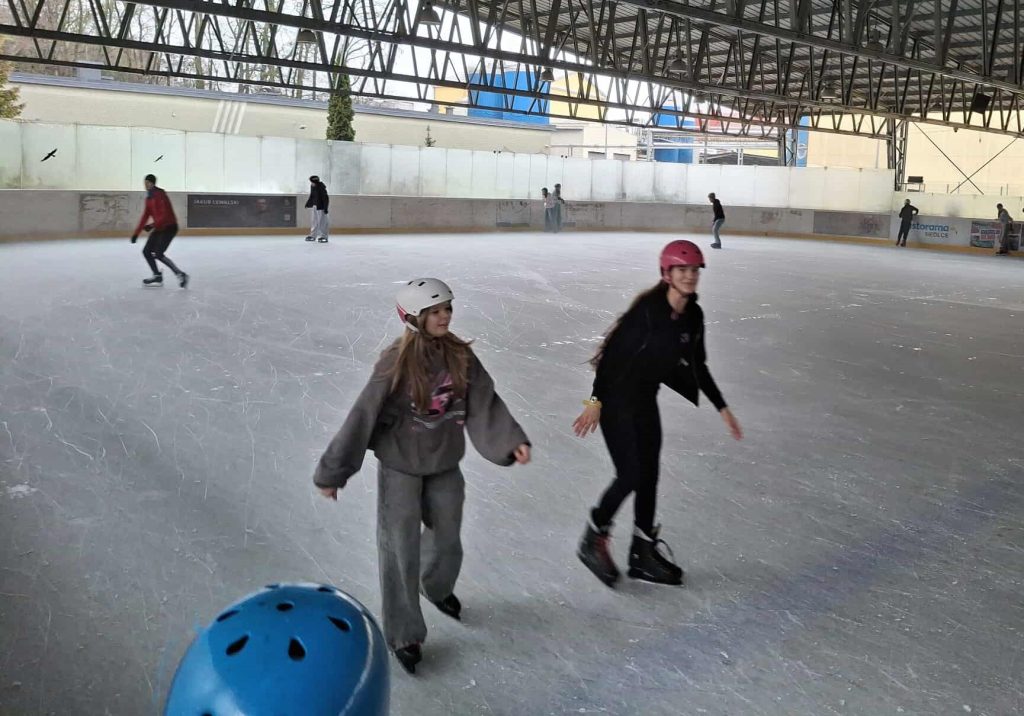 Dzień rozpoczął się na lodowisku, gdzie młodzież z zapałem i uśmiechem na twarzy szlifowała jazdę na łyżwach, a atmosfera była pełna energii i świetnej zabawy.