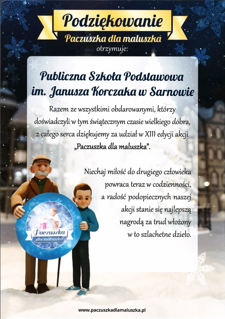 Nasza szkoła, jak co roku, przyłączyła się do Akcji Paczuszka dla Maluszka. Akcja ta jest objęta patronatem Fundacji Małych Stópek. Jej adresatem są zaprzyjaźnione Domy Dziecka, Domy Samotnej Matki czy Domy Małego Dziecka. Nasza szkoła w tym roku obdarowała Placówkę Oświatowo-Wychowawcza w Adamowie.