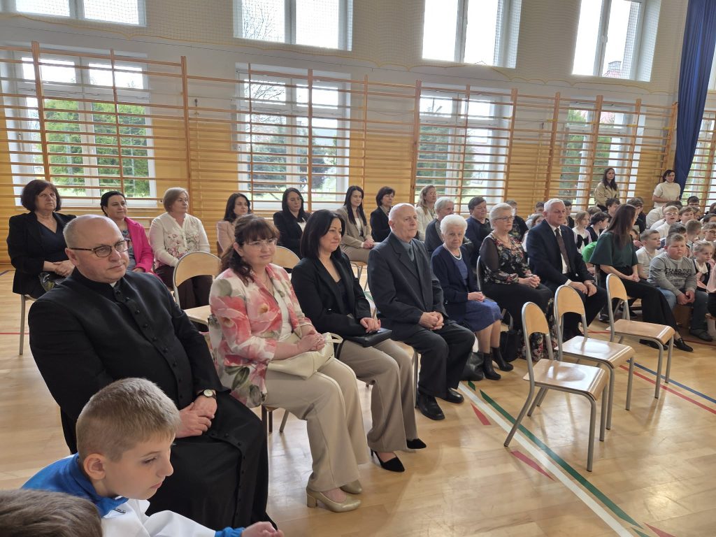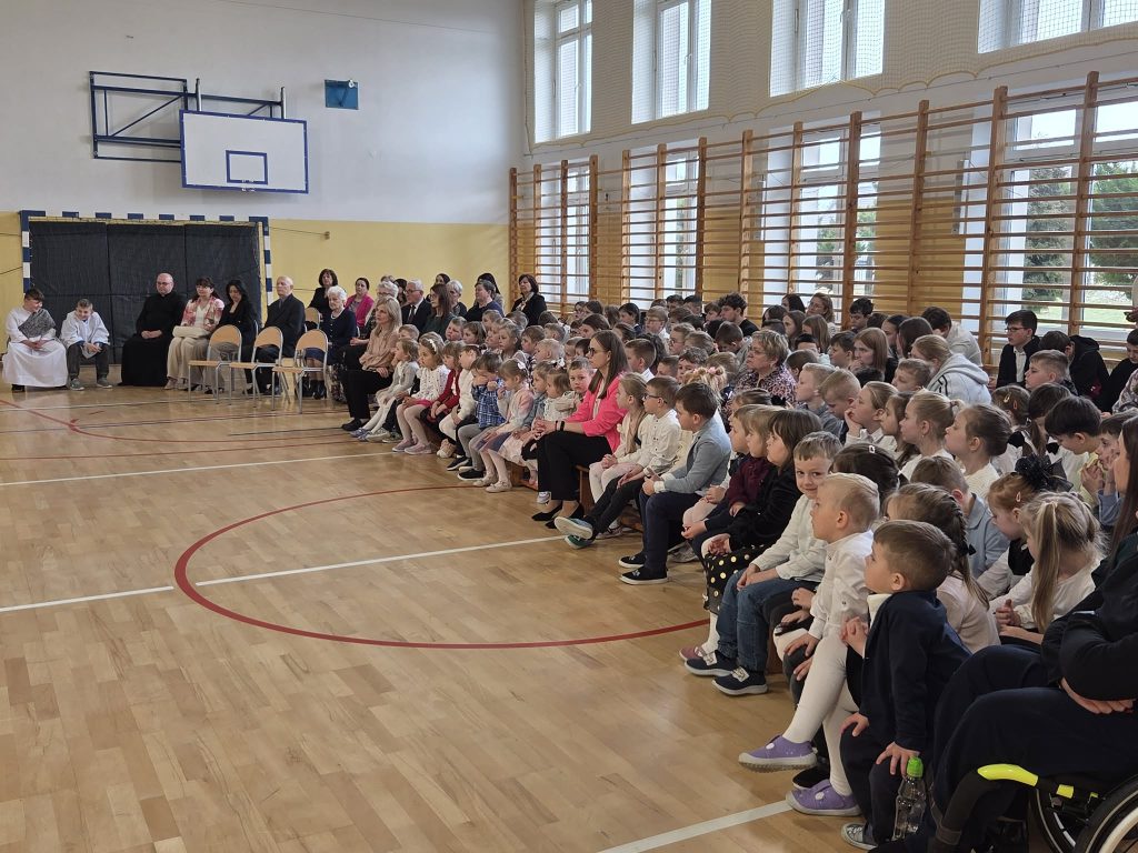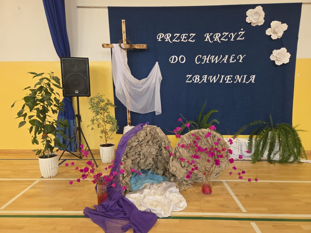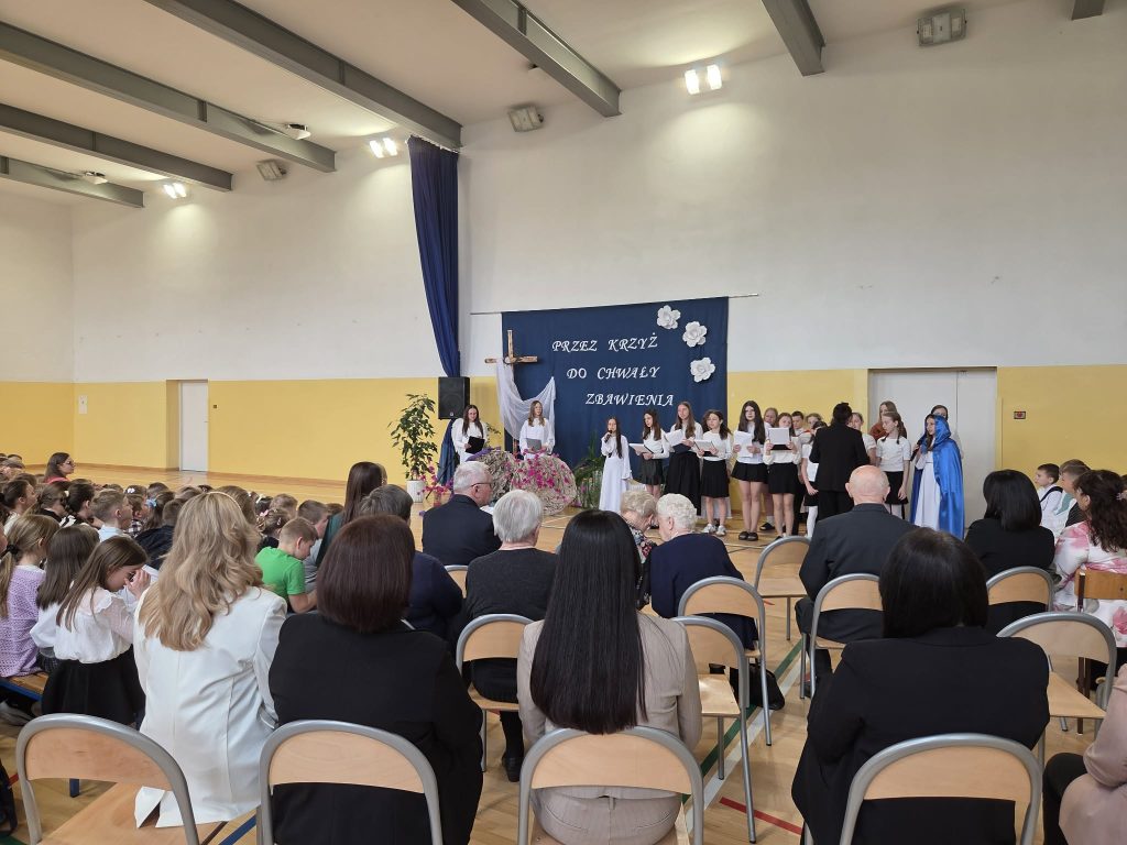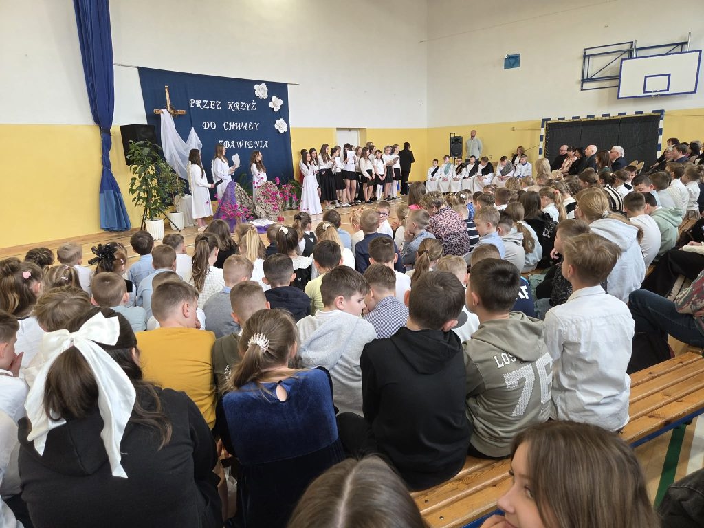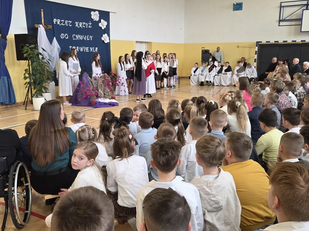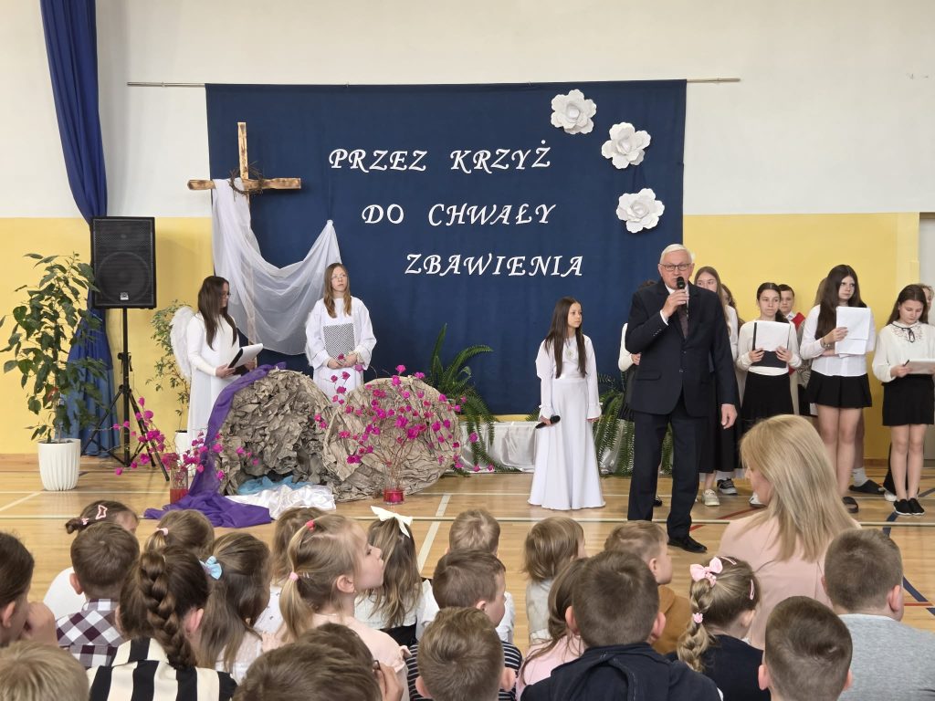 W przeddzień Triduum Paschalnego w dniu 1 kwietnia 2026 r. w naszej szkole odbyła się uroczysta akademia wielkanocna pod hasłem „Przez krzyż do chwały zbawienia”. Dyrektor szkoły pan Karol Kłos powitał zebranych, nadmieniło przesłaniu płynącym ze zbliżających się Świąt i przekazał głos uczniom. W uroczystości z udziałem zaproszonych gości  ks. Proboszcza Adama Daniluka, emerytowanych nauczycieli i pracowników szkoły oraz przedstawicieli Rady Rodziców uczestniczyła cała społeczność szkolna. Uczniowie z klas IV-VI wystąpili w montażu słowno-muzycznym przybliżającym wszystkim najważniejsze wartości w życiu każdego człowieka. Przedstawione scenki w wykonaniu młodych aktorów ukazywały ważne wydarzenia Zmartwychwstania Chrystusa oraz sens zbawienia. Głośno rozbrzmiewały pieśni pasyjne, którymi  wielkopostną  akademię uświetniał chórek szkolny ‘’Sarenki”. Występy uczniów wprowadziły zebranych w atmosferę nadchodzących Świąt Zmartwychwstania Pańskiego. Uczniów do akademii przygotowały: pani Grażyna Mućka, oprawę muzyczną pani Hanna Jamborska, zaś dekorację wykonały: pani Magdalena Mućka i pani Edyta Kowalska.