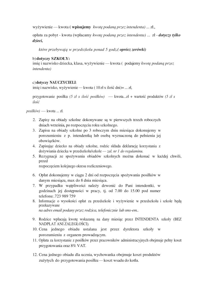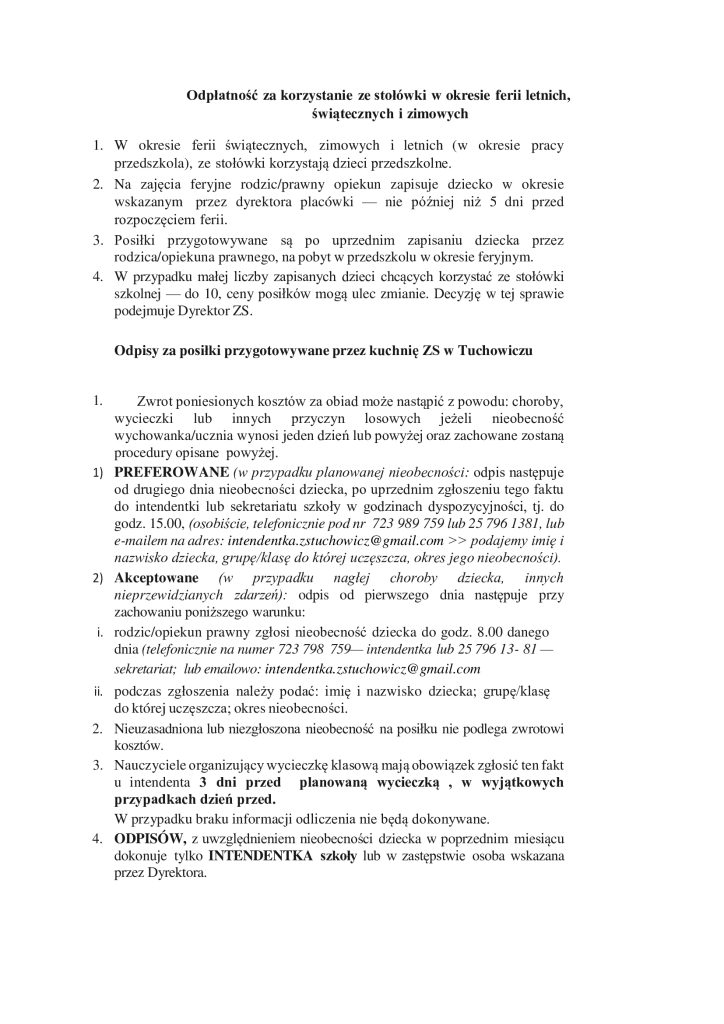 Nieobecność zgłaszamy dzień przed lub w nagłych przypadkach rano do godziny 8.00 do Pani Iwony Przybysławskiej