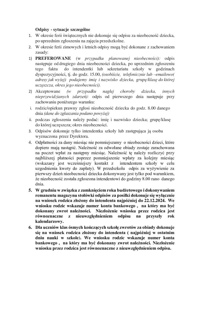 W związku z zamknięciem roku budżetowego w grudniu, odpisów dokonuje się na wniosek rodzica złożony najpóźniej do dnia 22. 12. 2025 r. We wniosku należy wskazać numer konta bankowego, na który ma być dokonany zwrot należności. Niezłożenie wniosku przez rodzica jest równoznaczne z nieuwzględnieniem odpisu na przyszły rok kalendarzowy.