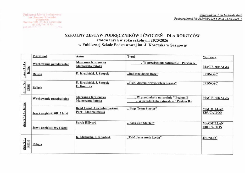 | dzieci 5 – letnie | Religia | D. Krupiński, J. Snopek | „Spotkania dzieci Bożych” | JEDNOŚĆ |
