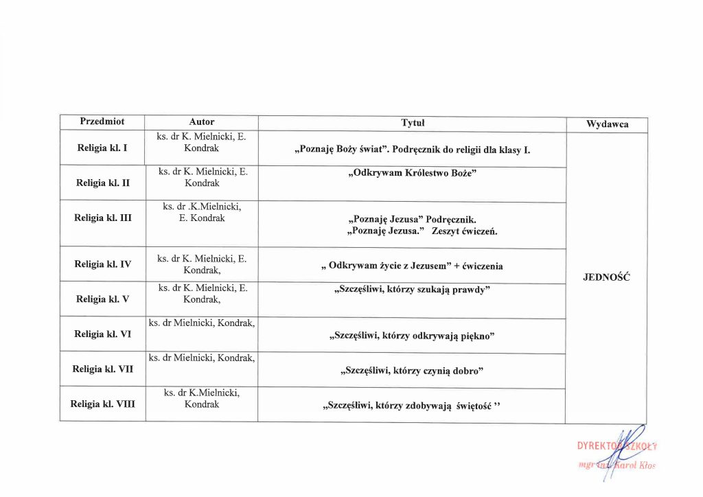 | Religia kl. VIII | Mielnicki, Kondrak, Parszewska | „Błogosławieni, którzy ufają Jezusowi” | JEDNOŚĆ |